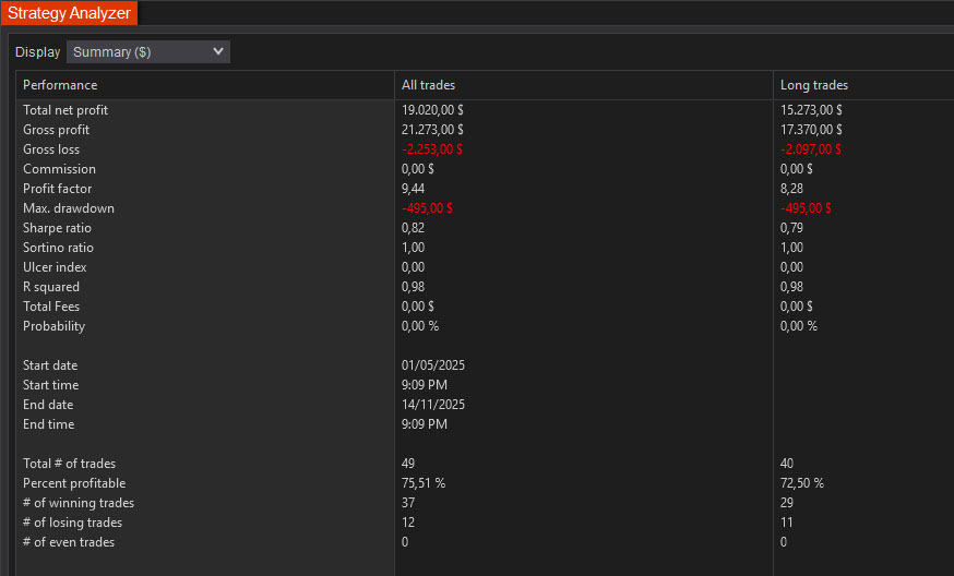 Estas cifras corresponden a la lógica ATM, que deja un histórico de operaciones reproducible en el Strategy Analyzer. Las señales SDA complementan esa estadística en tiempo real, pero no pueden generarse 1:1 en backtest porque se adaptan continuamente al flujo de órdenes y al contexto vivo de cada sesión.